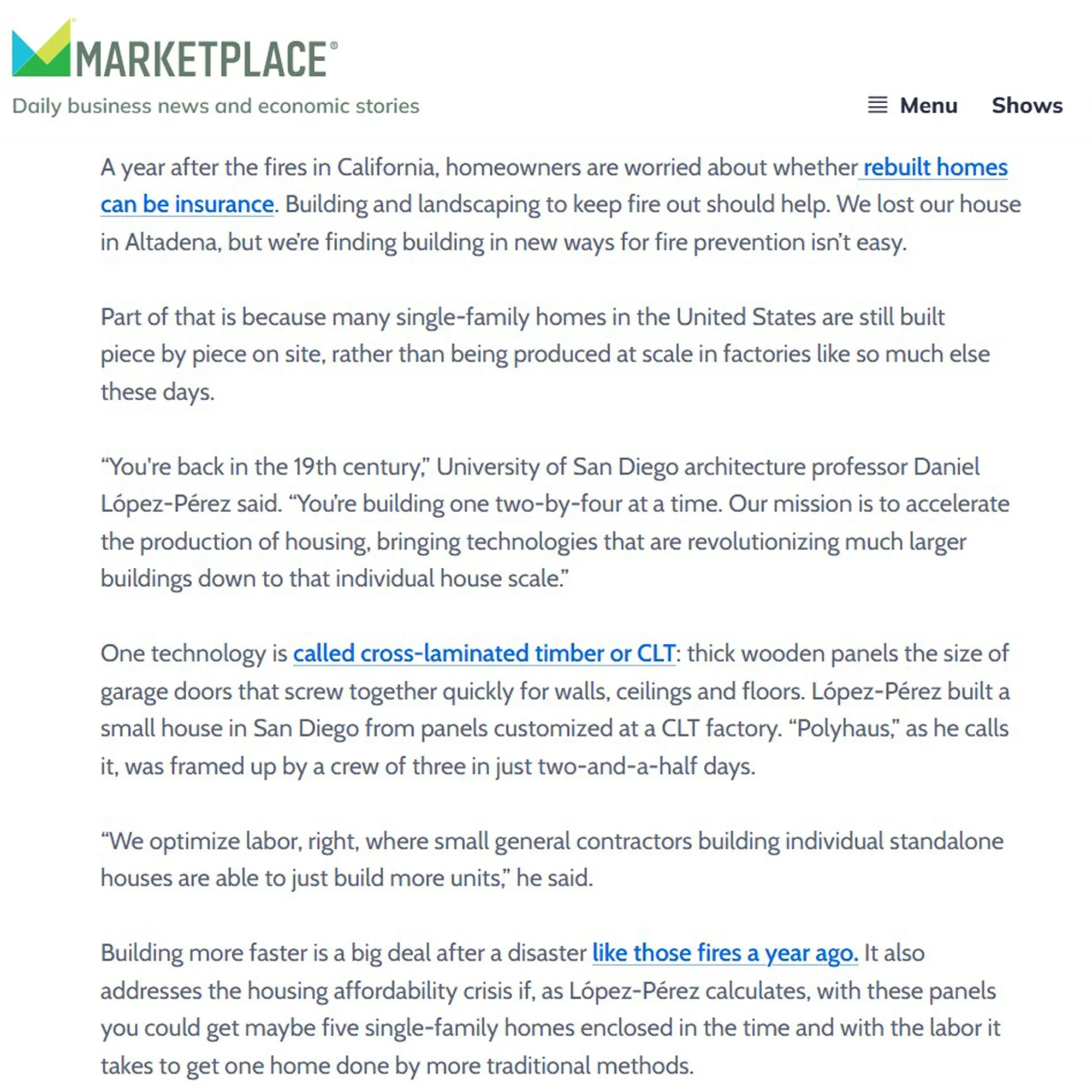 “You're back in the 19th century,” University of San Diego architecture professor Daniel López-Pérez said. “You’re building one two-by-four at a time. Our mission is to accelerate the production of housing, bringing technologies that are revolutionizing much larger buildings down to that individual house scale.”